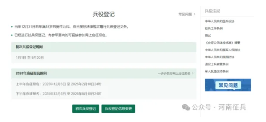 2026年全国征兵网网上登记报名于2025年12月6日开始。广大适龄男青年可登录全国征兵网进行兵役登记和应征报名,之后根据兵役机关安排进行实地初检初核。